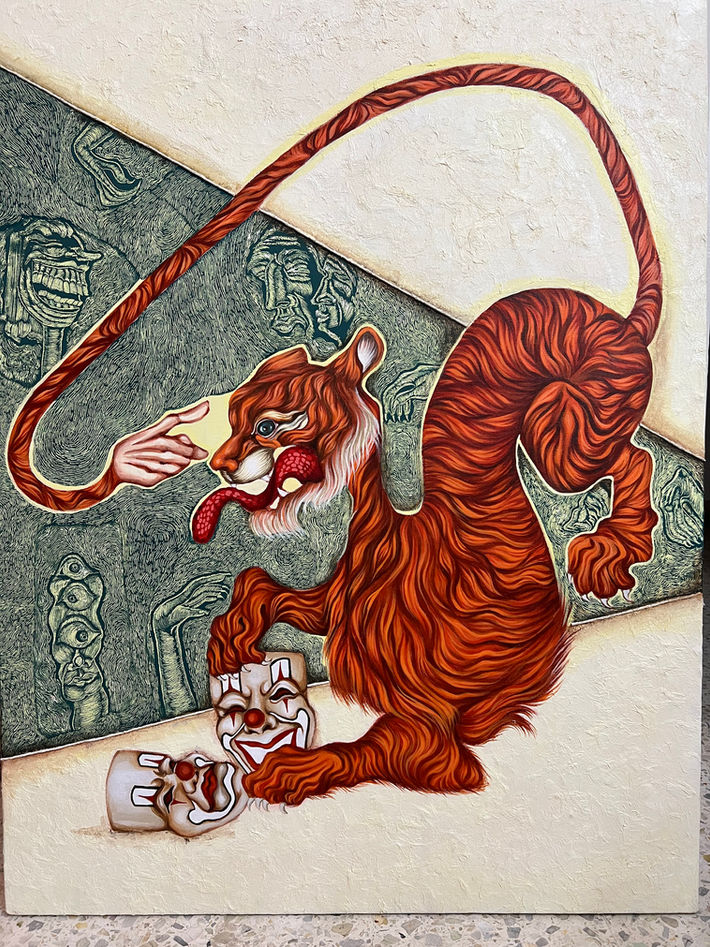 "Metamorphosis Stripes" is an evocative painting portraying a majestic tiger amid intricate stripes symbolizing our insecurities. Through vibrant hues and bold strokes, it inspires viewers to embrace vulnerability as strength, urging them to confront and transform their insecurities into catalysts for personal growth and resilience.